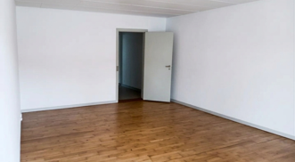 Opholdsrummet fremstår lyst og indretningsvenligt med trægulve, hvide vægge og et bredt vindue, som giver et behageligt lysindfald. Her er god plads til både seng, sofa og en mindre spiseplads.