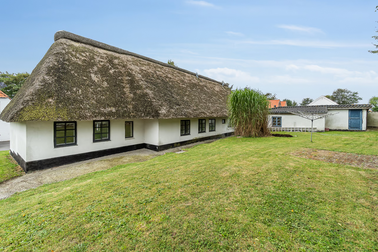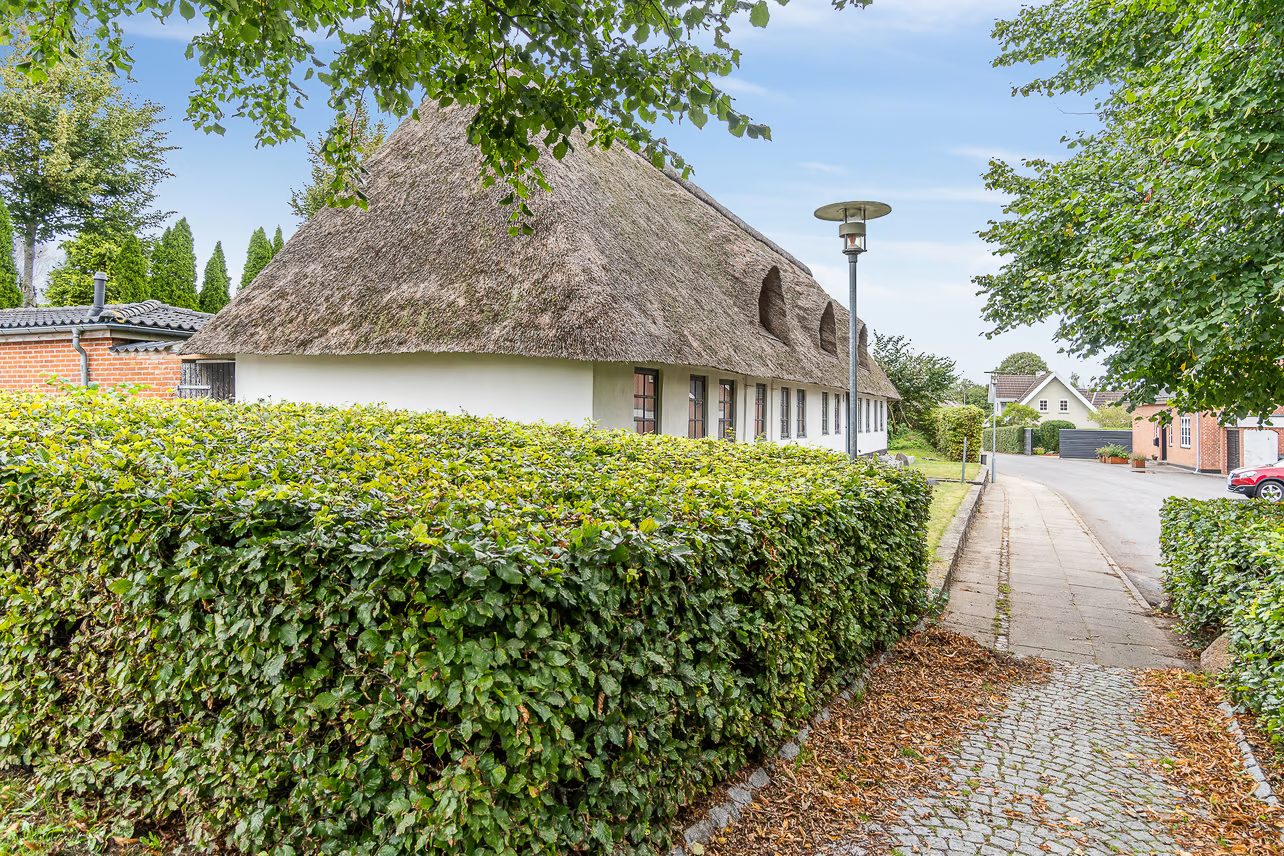 Velkommen til en hyggelig og karakterfuld villa med stråtag, hvid facade og blå vinduespartier – beliggende midt i dejlige Almind, hvor hverdagen fungerer ubesværet med alt tæt på.