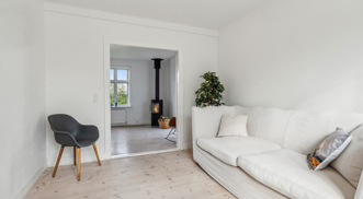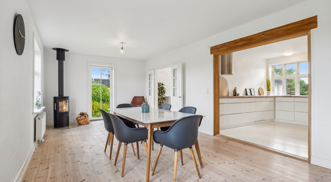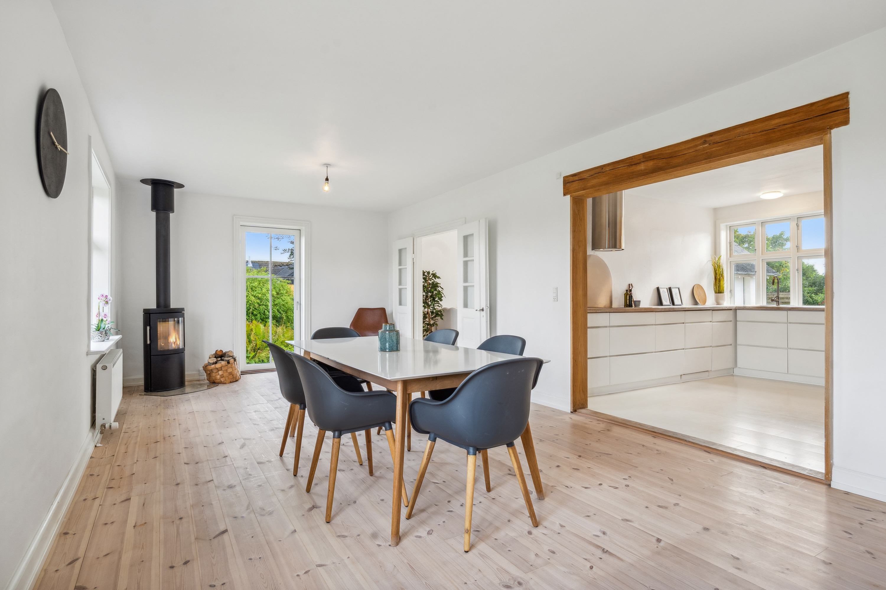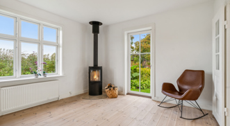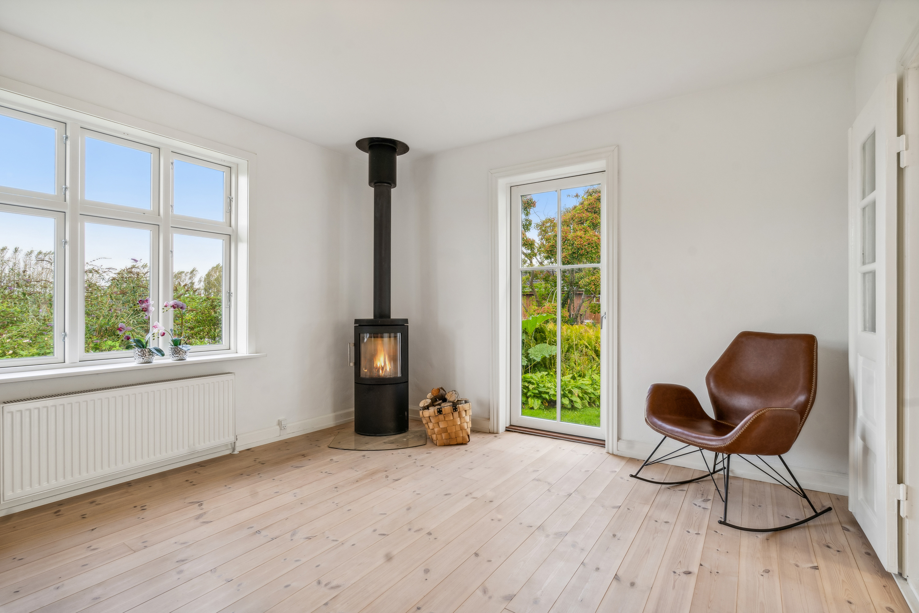 ✅ Stor stue med brændeovn og plads til både sofaområde og spisebord